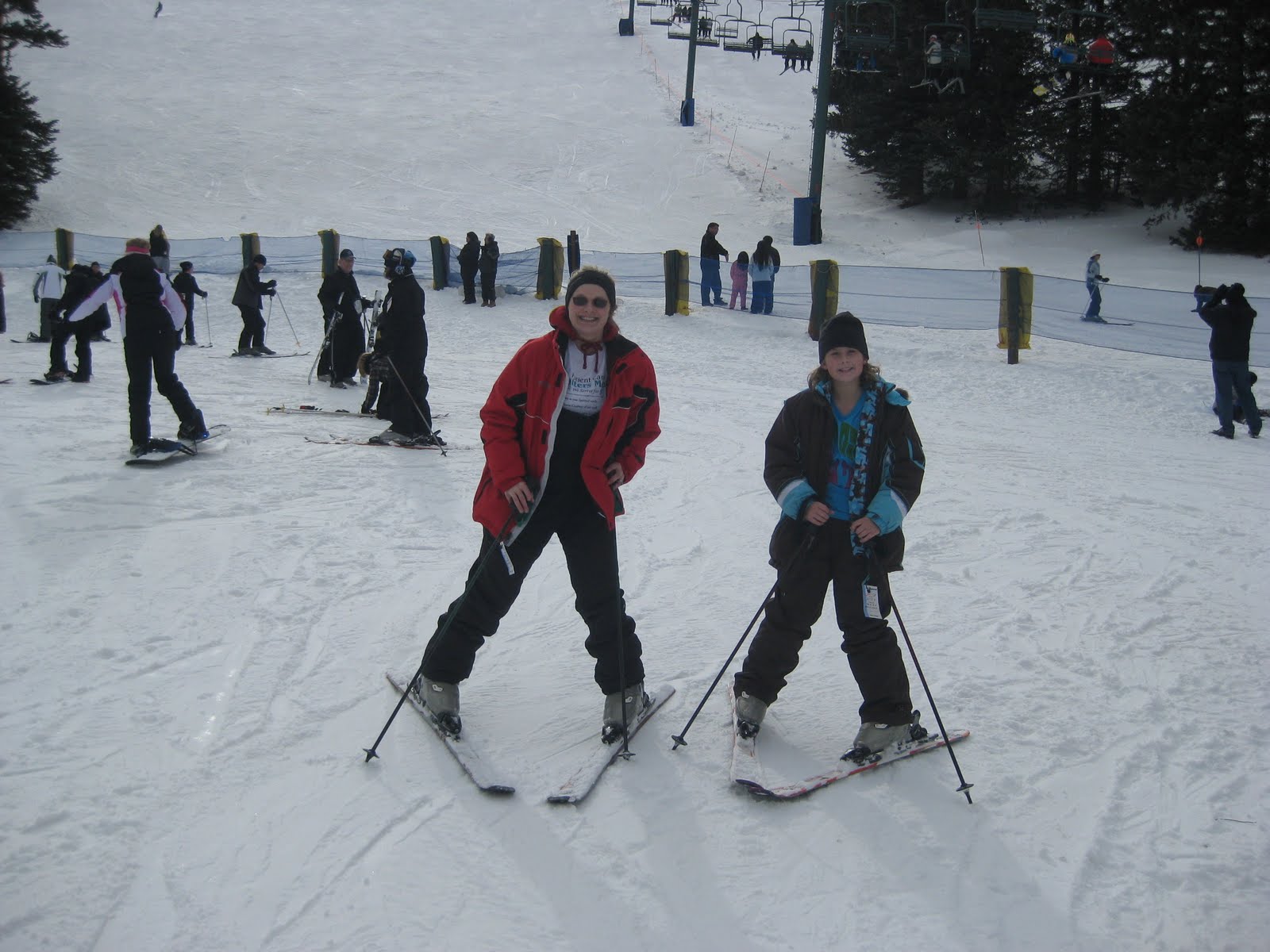 Saturday we got up bright at early and drove to Santa Fe. We were so excited because they had gotten 17 inches of snow the previous day. It was beautiful! The trees were glittery and absolutely gorgeous. When we got to the ticket counter we noticed a sign indicating that there was a frost bite warning in effect. We thought Sandia was cold, the windchill in Santa Fe was -40!!! We have never worn so many layers to ski in.